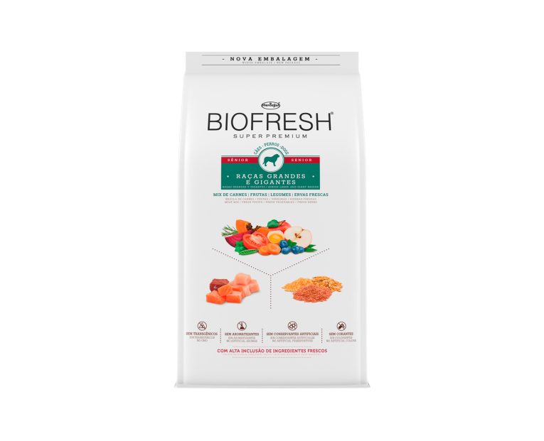 Biofresh Senior Razas grandes o gigantes es un alimento Super Premium completo y equilibrado que se destaca para elevar la nutrición de los perros mayors de razas grandes y gigantes a su más alto nivel. Biofresh Super Premium Senior ayuda a preservar características muy importantes de la juventud, tales como los músculos fuertes, la agilidad mental y la salud de los aparatos digestivo, renal y cardíaco. Biofresh es innovador y diferente, porque esta formulado con una alta inclusión de ingredientes realmente frescos, directamente de la naturaleza. La tecnología Biofresh garantiza la conservación de este alimento de forma 100% natural y segura, sin conservantes artificiales añadidos.
