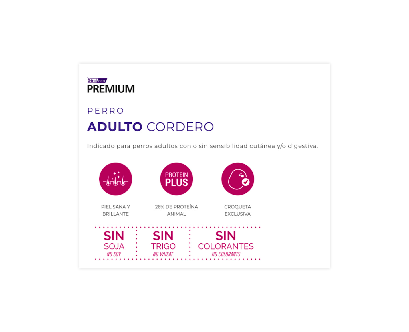 La fórmula Premium Perro Adulto Cordero es una excelente alternativa que aporta niveles de energía adecuados para la etapa adulta, colabora con una piel sana, un pelo brilloso y además brinda ingredientes de gran digestibilidad para perros con o sin sensibilidad cutánea y/o digestiva.
